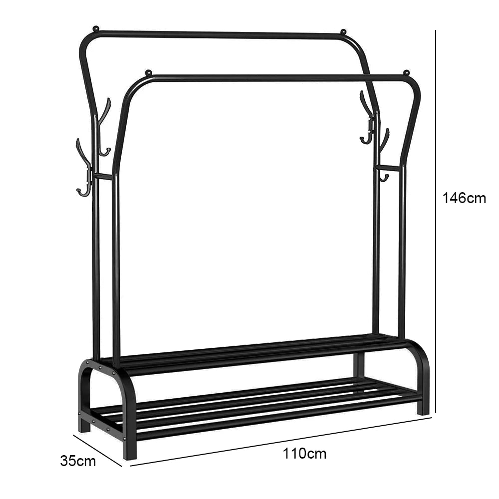 Wieszak na ubrania z podwójnym drążkiem i półkami – metalowy