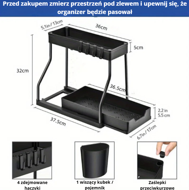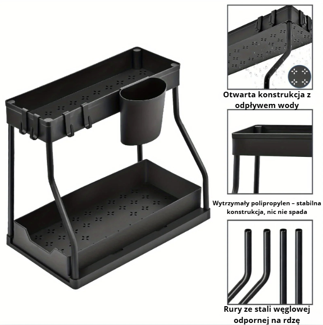 Ten bestsellerowy organizer to idealne rozwiązanie do kuchni i łazienki, szczególnie pod zlew lub w strefie roboczej. Wysuwane szuflady, wodoodporna konstrukcja i kilka poziomów przechowywania sprawiają, że nawet trudno dostępne miejsca stają się w pełni funkcjonalne.